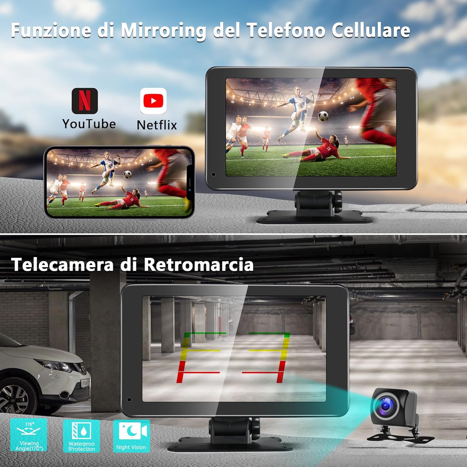 Inoltre, dashcam e videocamera posteriore permettono di avere un’assistente di parcheggio e una videosorveglianza di sicurezza in ogni momento, offrendoti tranquillità e protezione.